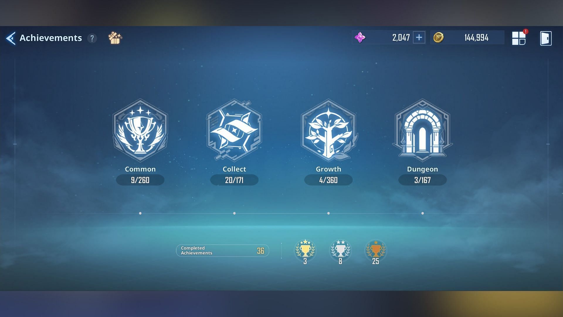 Achievements offer multiple missions in four categories: Common, Collect, Dungeon, and Elevate. You can find a few missions in all the categories except the Dungeon, which grants Essence Stones in Solo Leveling: Arise.