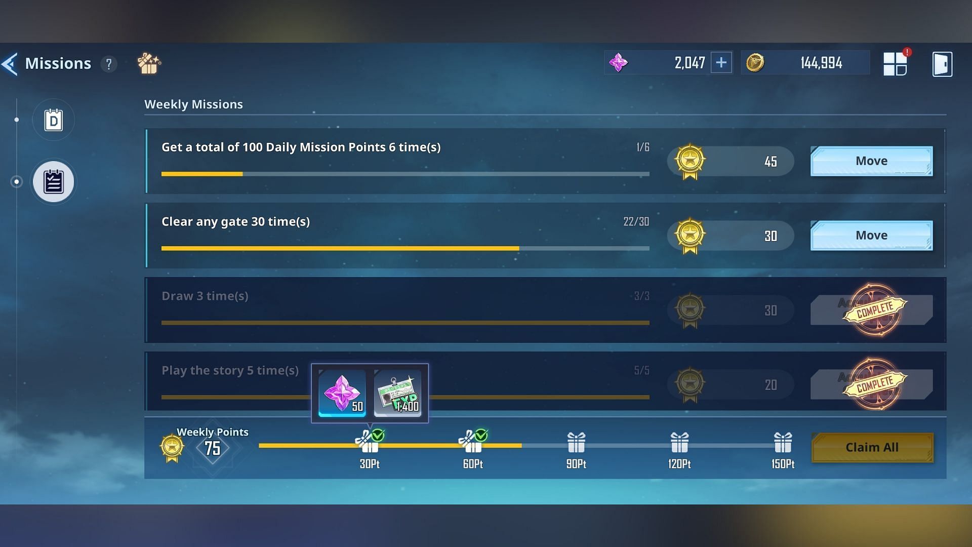 Each tier offers three battle missions, which grant 15 Essence Stones each upon completion. One Encore Mission key is required to play every stage, and you get three keys for free daily.