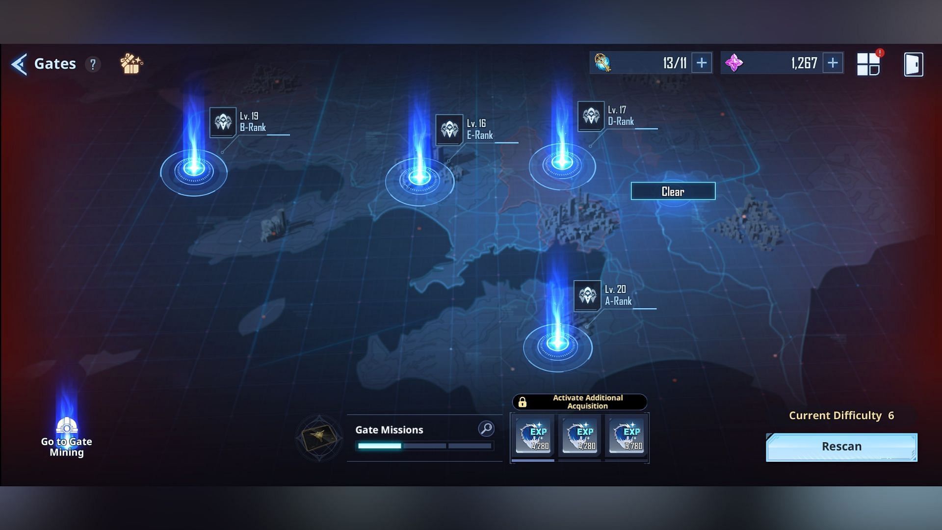 Gates also has varying difficulty levels, which change based on Sung Jinwoo’s in-game level. The more you upgrade Jinwoo, the more difficulty you unlock. You can click the rescan button at the bottom right to change the difficulty.