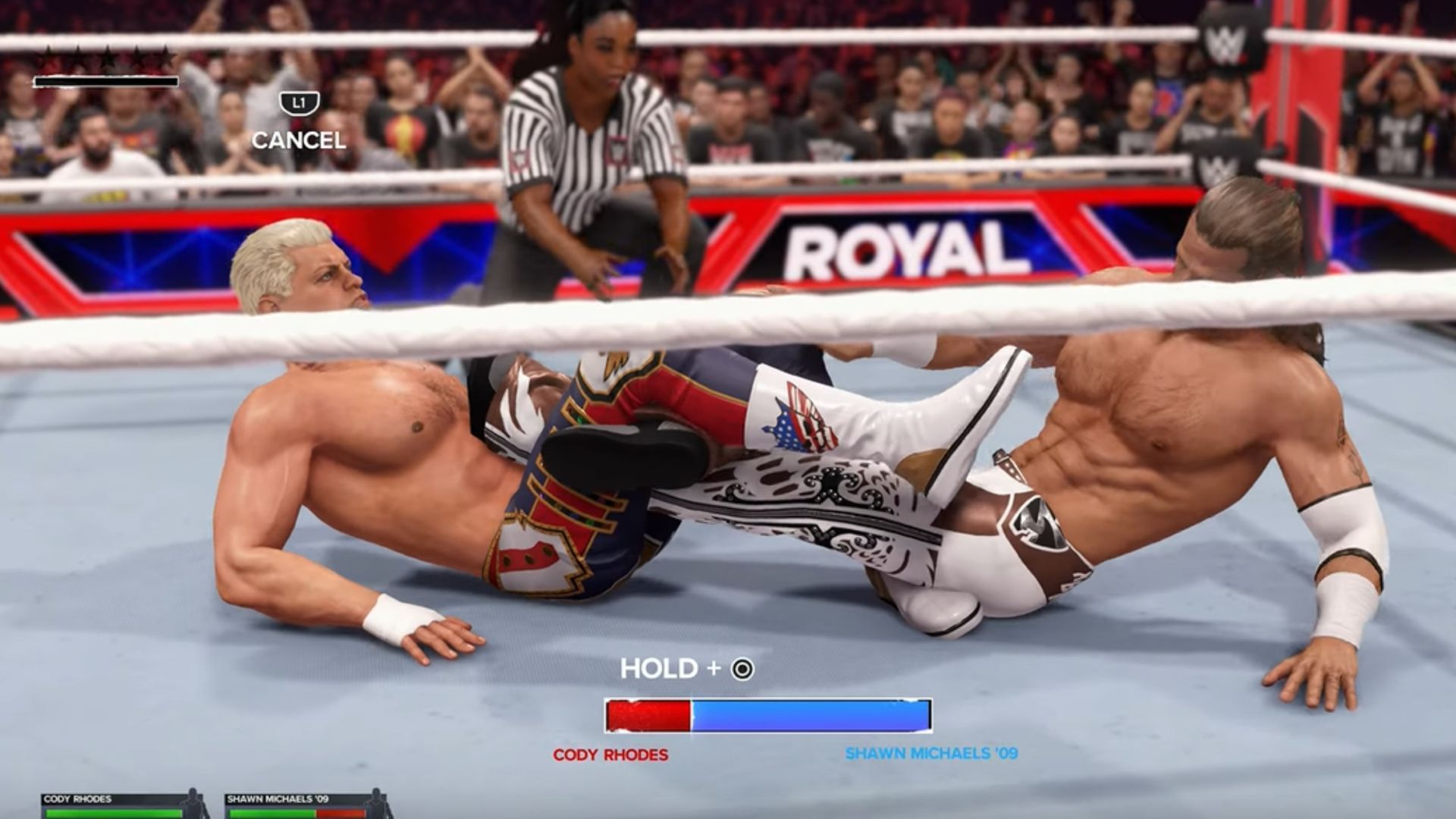 After that, you must execute a submission move to trigger a mini-game, where you must hold down the required action button to force your opponent to submit. Though this process may seem complex, don't worry, as there are specific settings you can adjust to tilt the odds in your favor.