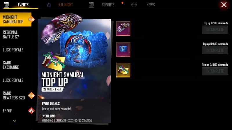 Step 2: They have to navigate the events section and press the "Midnight Samurai Top Up" tab.