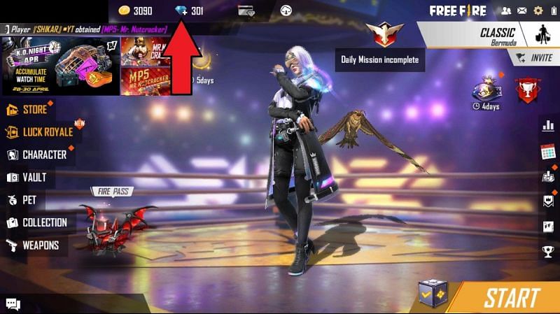 Step 1: Open Free Fire and click on the ‘Diamond’ icon located at the top of the screen.