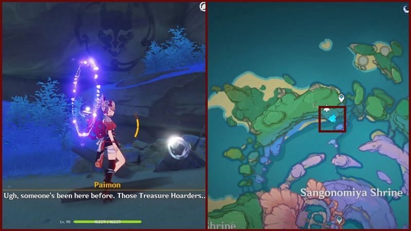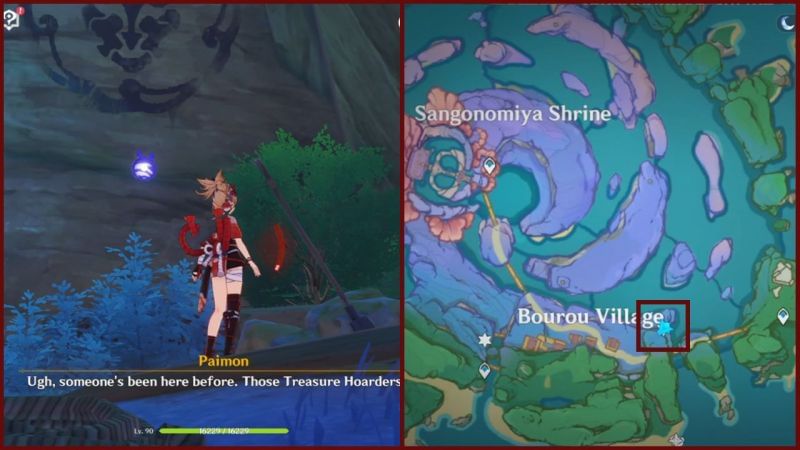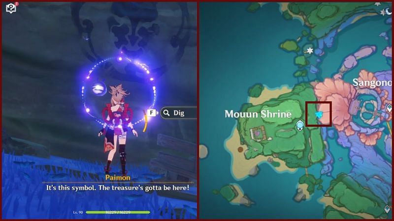The first treasure location can be spotted southwest of the Waypoint on the northern end of the Sangonomiya Shrine. Teleport to the location and head southwest until you see the symbol on the wall beside a broken carriage.