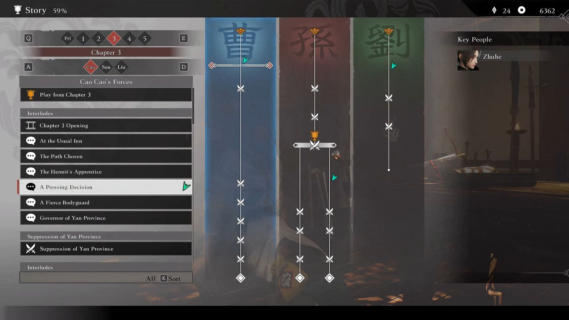 Once Chapter 3 begins, a new interface appears in the upper-left corner of the screen, displaying three faction leaders — Cao Cao, Liu Bei, and Sun Jian — each with a set of favor diamonds next to their names. To gain favor with a faction, you must participate in battles on their behalf. Each completed battle fills a diamond for the respective leader, increasing your standing with them.