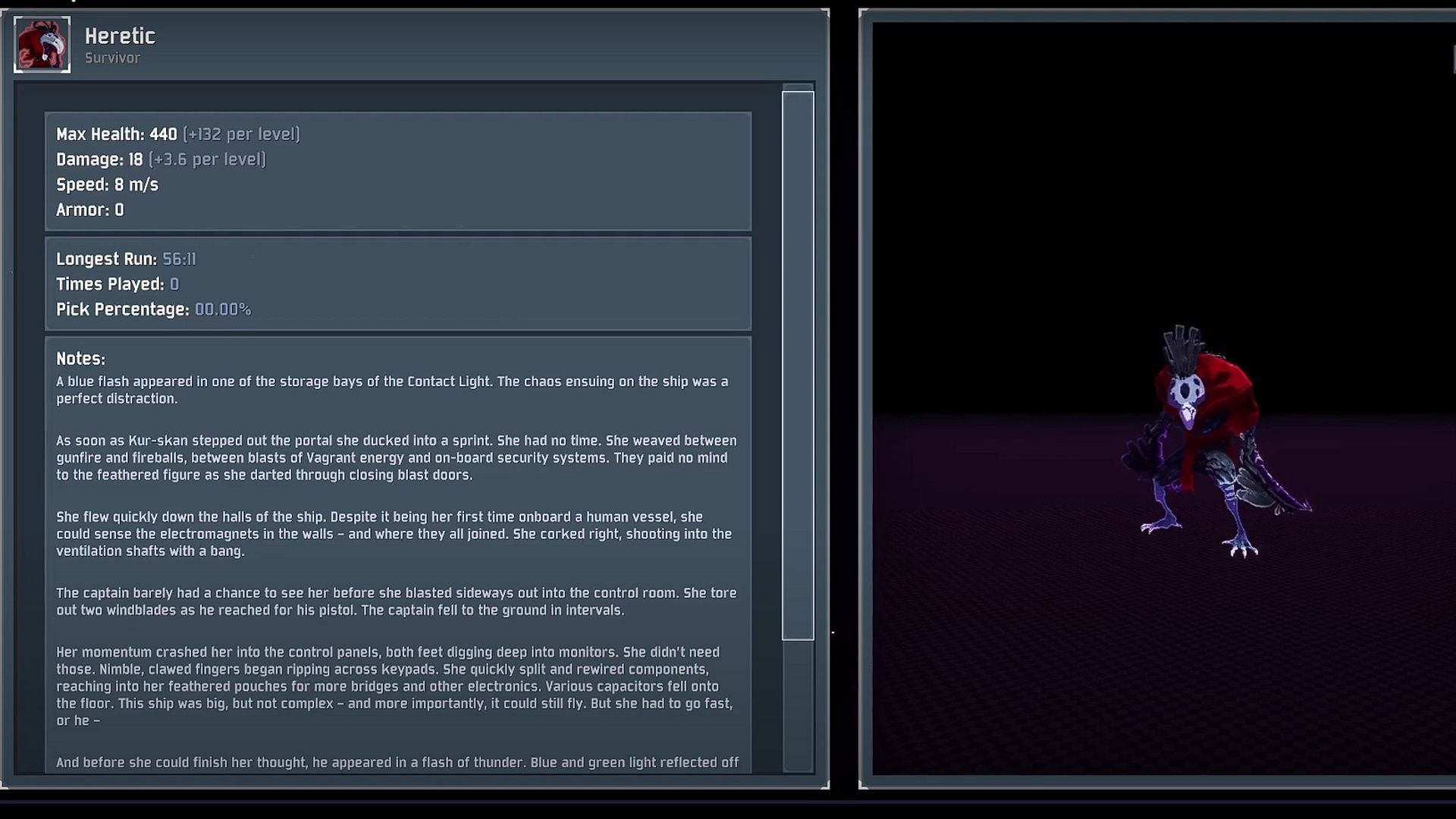 The Heretic boasts several unique attributes that set her apart from other survivors. She has an extremely high base health, can triple jump, and moves faster than any other character. Additionally, she has a significantly higher base damage stat.