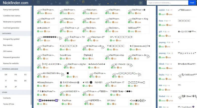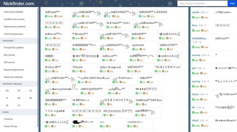 Players can find stylish names like Raistar and SK Sabir Boss on websites like Nickfinder, as shown in the pictures below: