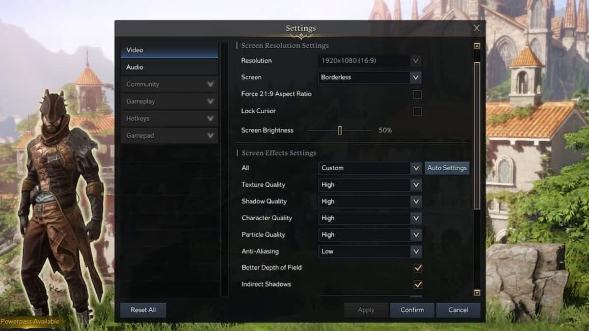 Next, go to the Screen Effects Settings area. You can change each one individually or set the All option to Low. This will switch all the settings on that list to Low. Turning off Better Field of Depth and Indirect Shadows will also help.