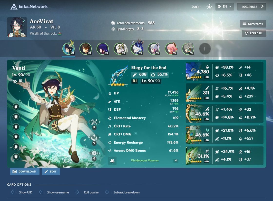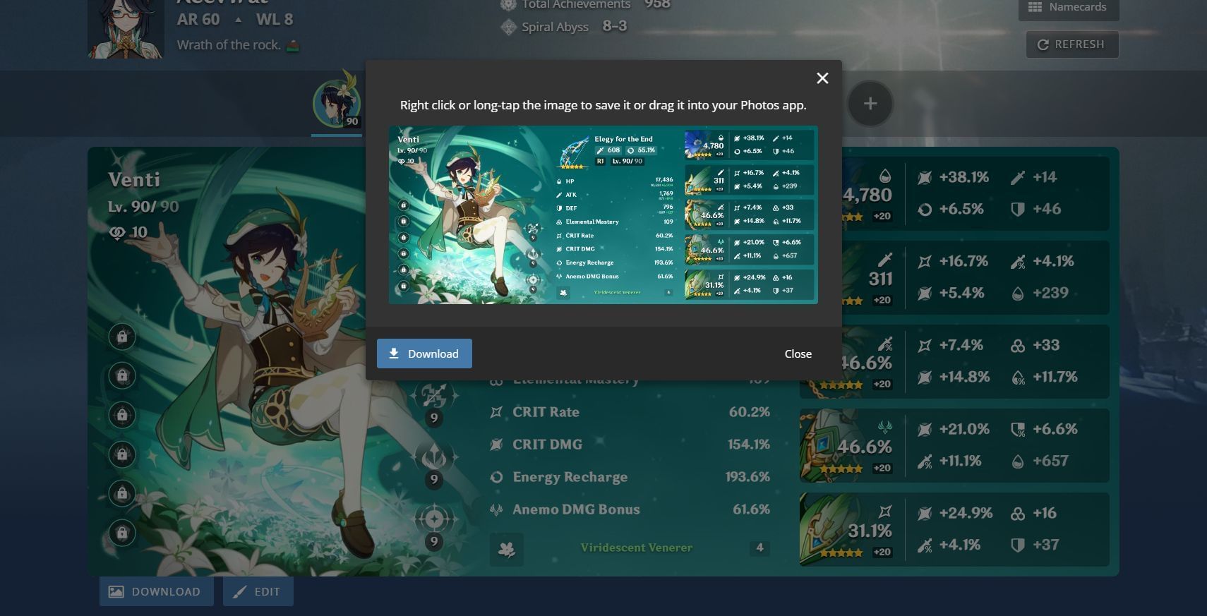 Players can use Enka.network to create character-build cards that reflect the stats, weapons, artifacts, and more about your selected units in a graphical format. You can easily download it as an image and share it with your friends to flex on them.