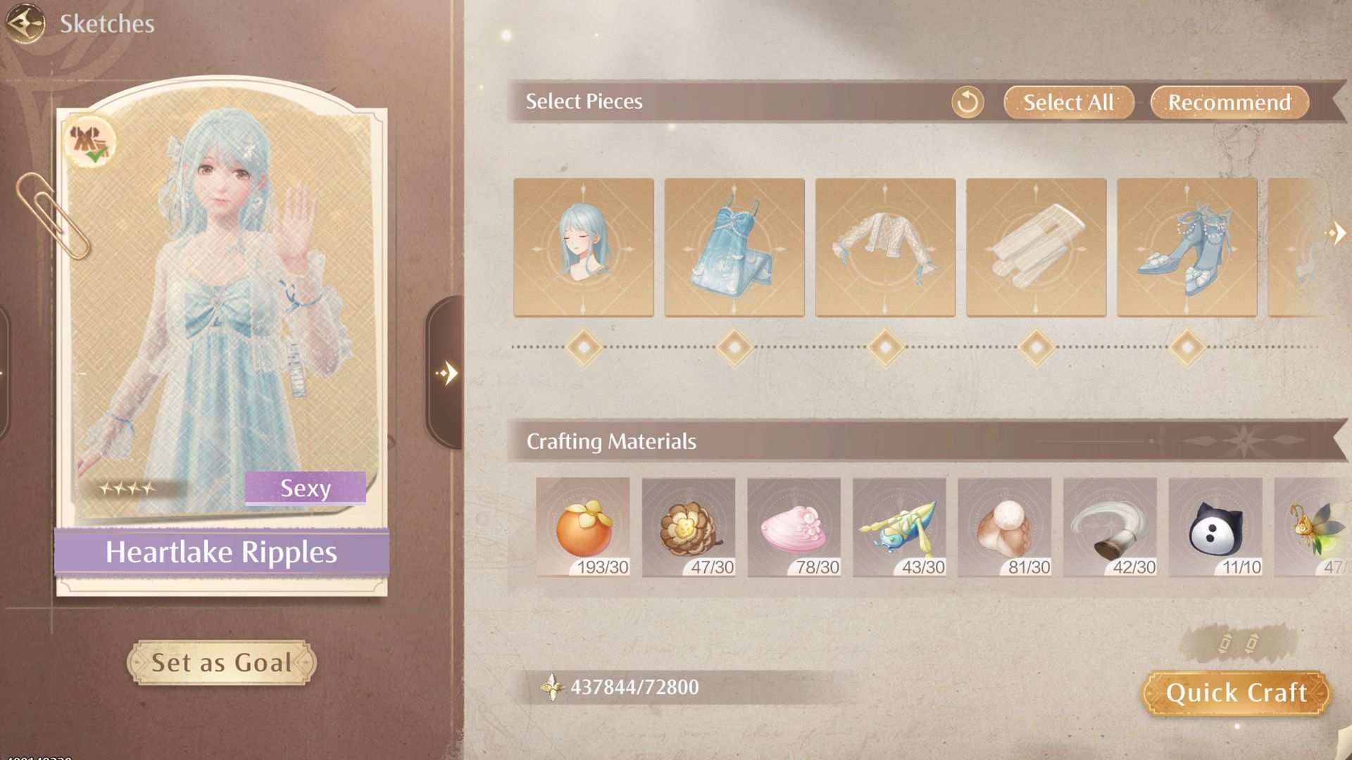 In order to craft the Heartlake Ripples outfit, you will need to unlock the corresponding outfit sketch nodes from the Heart of Infinity (Sea of Stars shard). There are a total of 10 sketches that you will need to unlock using Ethereal Stars.