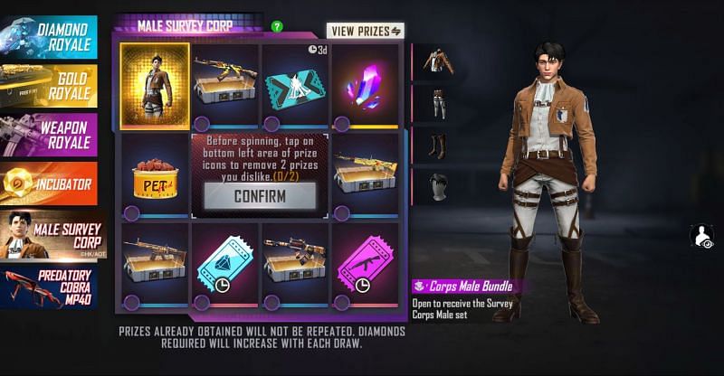 As mentioned earlier, the new exclusive bundle is only available on the Titan Wheel (Faded Wheel). Players will be able to obtain it between March 15 and March 25. There are a total of 10 rewards, including the grand prize for the Survey Corps Male bundle.