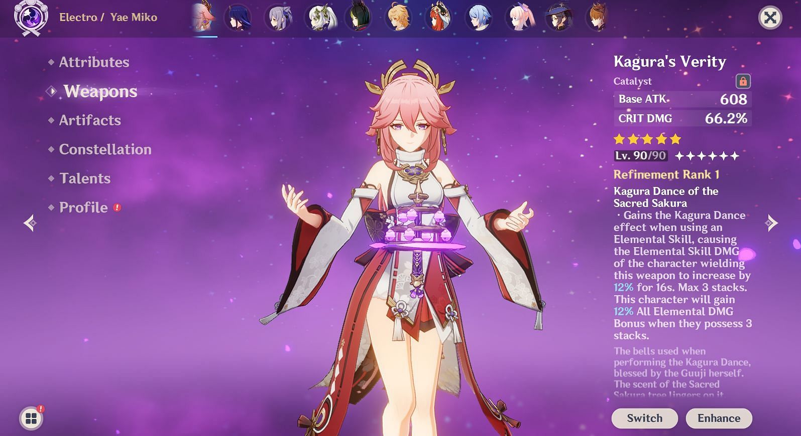 Kagura's Verity is the best 5-star weapon for the fox lady, especially with the high Crit Damage value from the secondary stat alone. While for the 4-star, The Widsith is a great replacement with slightly lower Crit Damage, but with a useful passive skill for Yae Miko to take advantage of.