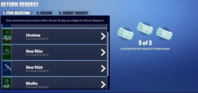 4. As Fortnite only allows the return of certain items, you will be taken to a screen where you can see the list of items that you are allowed to return. You will also see the remaining refund requests that your account has.