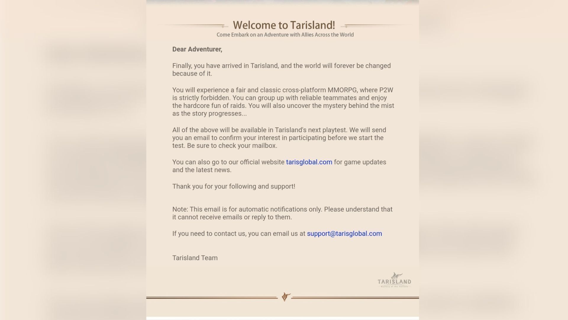 You must enter a valid email address in the dialog box. Click on the privacy policy button and subscribe. Then, you will receive an email from the official Tarisland account indicating that you have signed up for the game's upcoming closed beta testing. Here is the screenshot of the email that you receive after signing up:
