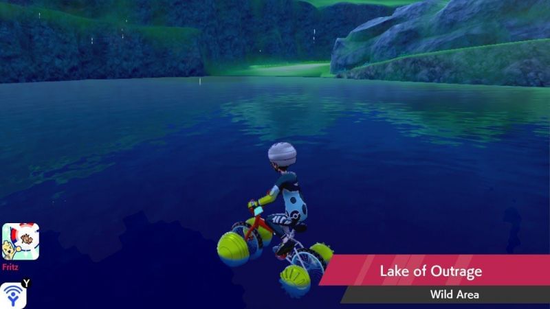 - Once you reach the bank of the Lake of Outrage, equip the upgraded Rotom Bike and prepare to cross the water.