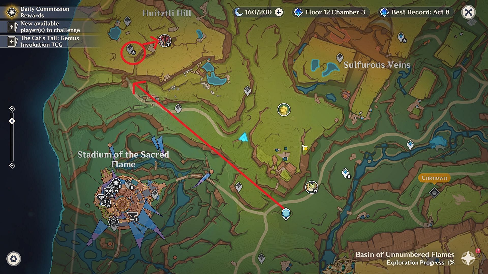 You will find a cave entrance in Huitztli Hill. Enter it and keep moving forward until you find the underground teleport waypoint and the boss arena. Approach the field to challenge the Goldflame Qucusaur Tyrant.
