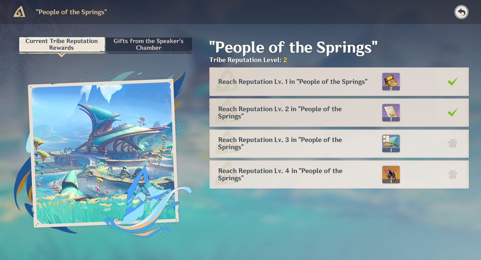 These are the rewards that you can get by gradually increasing your People of the Springs reputation: