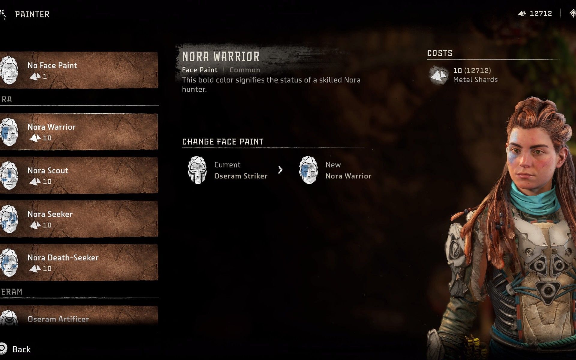 The Painter is a vendor who is marked with a tattoo needle symbol. This merchant will show the full list of Face Paints that Aloy has unlocked, and they are all split into different categories of tribes. To equip the desired Face Paint, players only need to spend about 10 Metal Shards.
