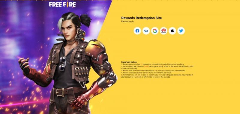 Step 2: Players must sign in to the website using the platform they have linked to their Free Fire account. The available platforms are Facebook, Google, VK, Twitter, Apple ID and Huawei ID.