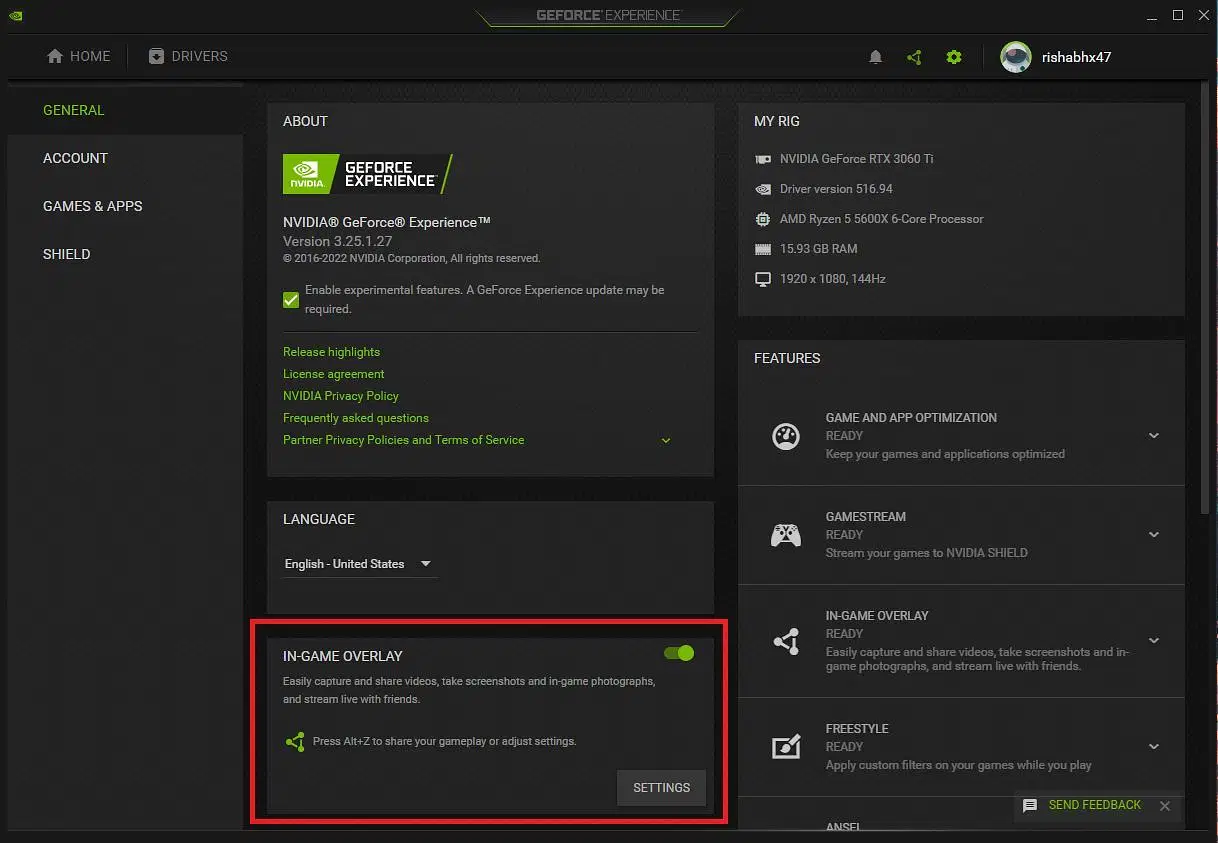 If the players have the above, they will have to open the NVIDIA GeForce Experience and then enable the ‘In-Game Overlay’ setting. By default, this option is enabled, but if for some reason it's turned off, players will have to manually enable it.