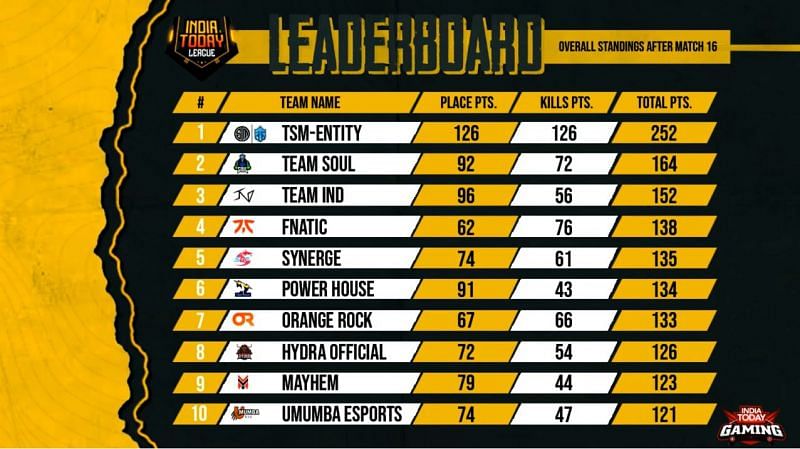 Team IND finished third in the tournament with a total of 152 points. TSM-Entity won 252 points, while Soul and Fnatic finished the competition with 164 and 138 points respectively. The statistics of the four matches of the final day are as follows.