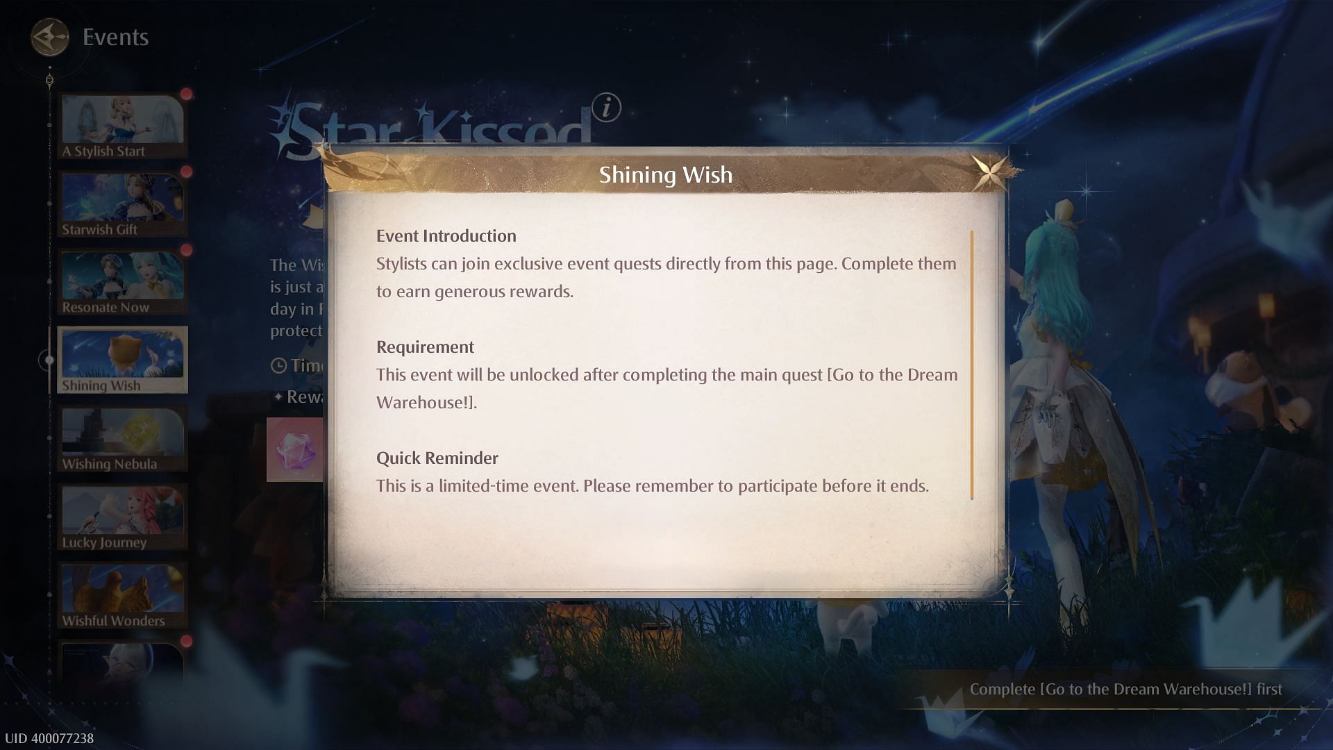 The Star-Kissed Wishes event launched with the Infinity Nikki 1.1 update on December 30, 2024. Players have roughly 25 days to complete all the essential tasks and claim the rewards before the event expires on January 23, 2024, at 12:49 AM (UTC-7). Only those who have completed the "Go to the Dream Warehouse!" main quest will be eligible to participate.