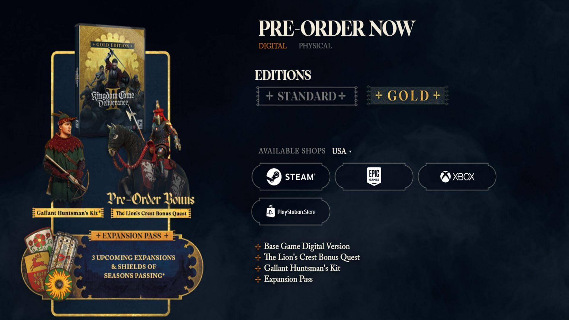 There are two digital editions of Kingdom Come Deliverance 2 you can currently purchase. First is the Standard Edition, which only includes the base game (and the pre-order bonus quest) and can be purchased for $59.99 on PC and $69.99 on consoles. The other is the Gold Edition which you can buy for $79.99 on PC and $89.99 on consoles. Purchasing the latter will give you the following items: