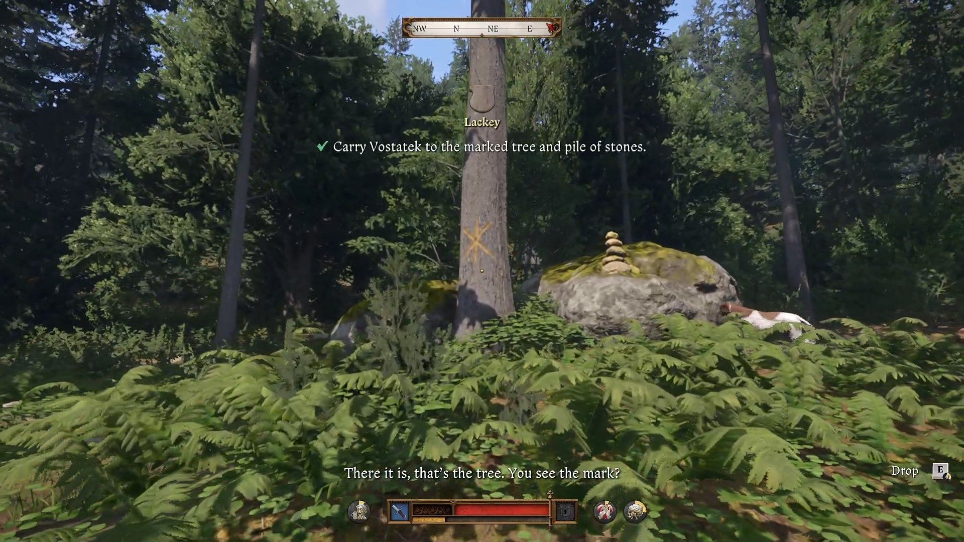 Then, follow the road along the stream northwards to find a split birch tree. Vostatek will now ask you to carry him into the forest and look for a tree marked with a mark. There's also a pile of stones beside the tree.