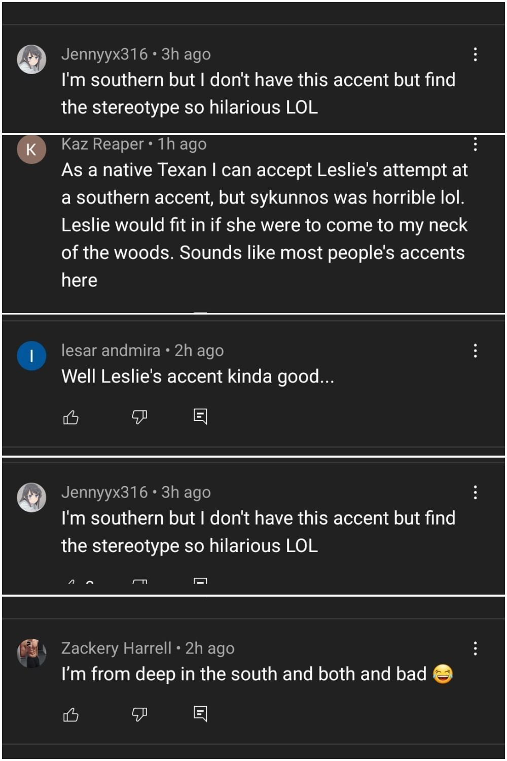 The overall consensus seems to be that Leslie had the superior accent, according to southerners and non-southerners alike. Some liked Sykkuno’s, though a few people thought they both sounded awful.