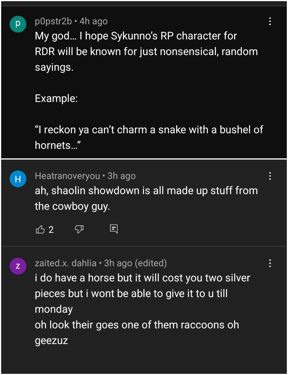 The fact that Sykkuno dropped pure nonsense with his first bit of dialogue made people hope that if he does stream Red Dead Redemption roleplay, he only says complete nonsense at all times, similar to what Clay Bailey did on Xiaolin Showdown.