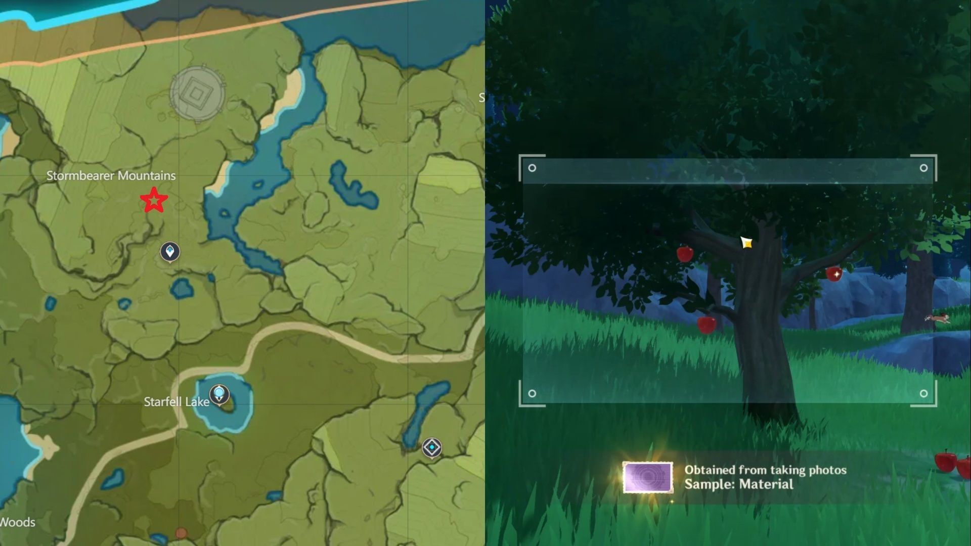 You can also find apples on the Stormbearer Mountain. From your previous location, head north. There is an apple tree right next to the road. You will also find two small animals near the tree, so it is easy to identify.