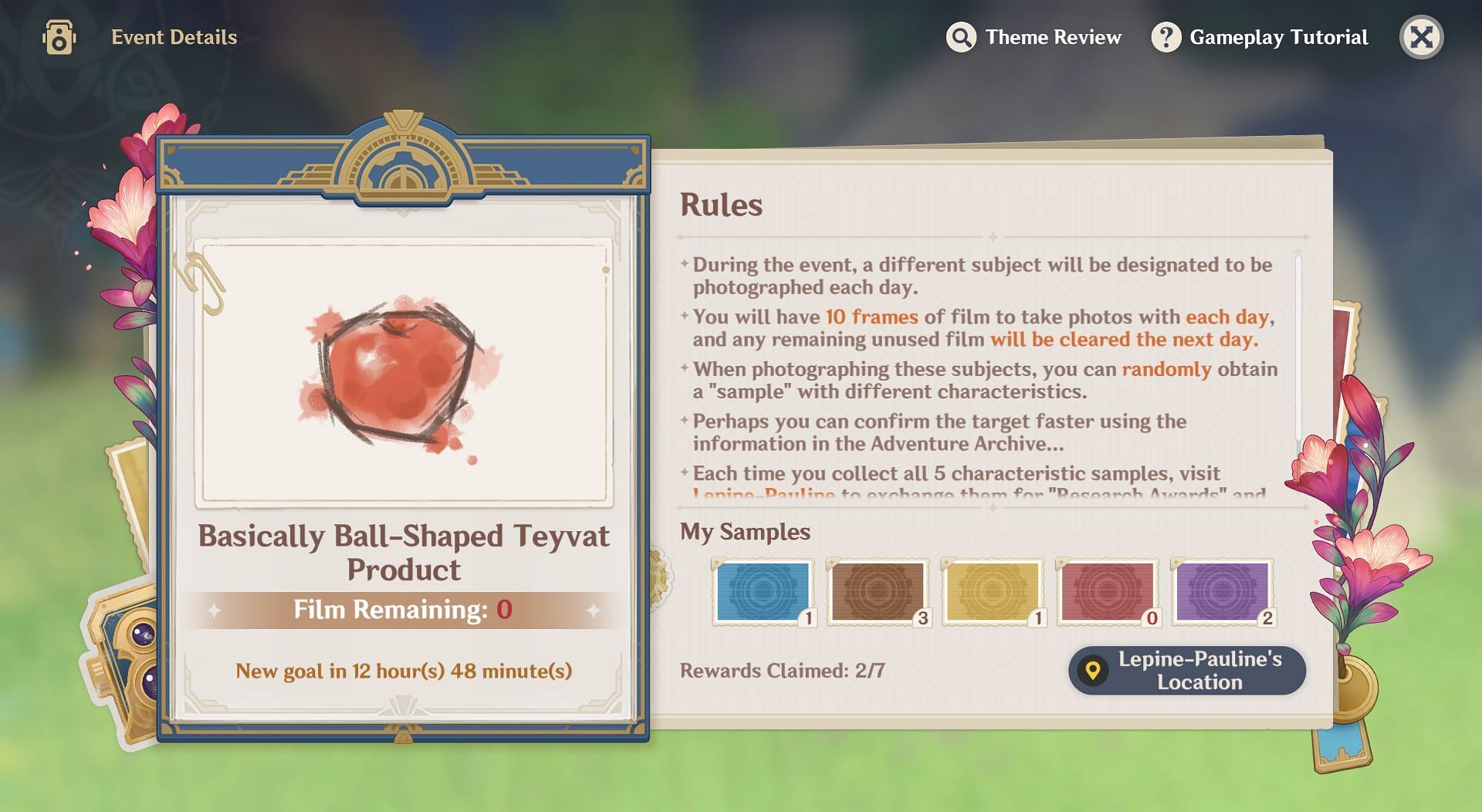 Taking photos of a 'Basically Ball-Shaped Teyvat Product' and exchanging the samples will reward you with 60 Primogems and other items.