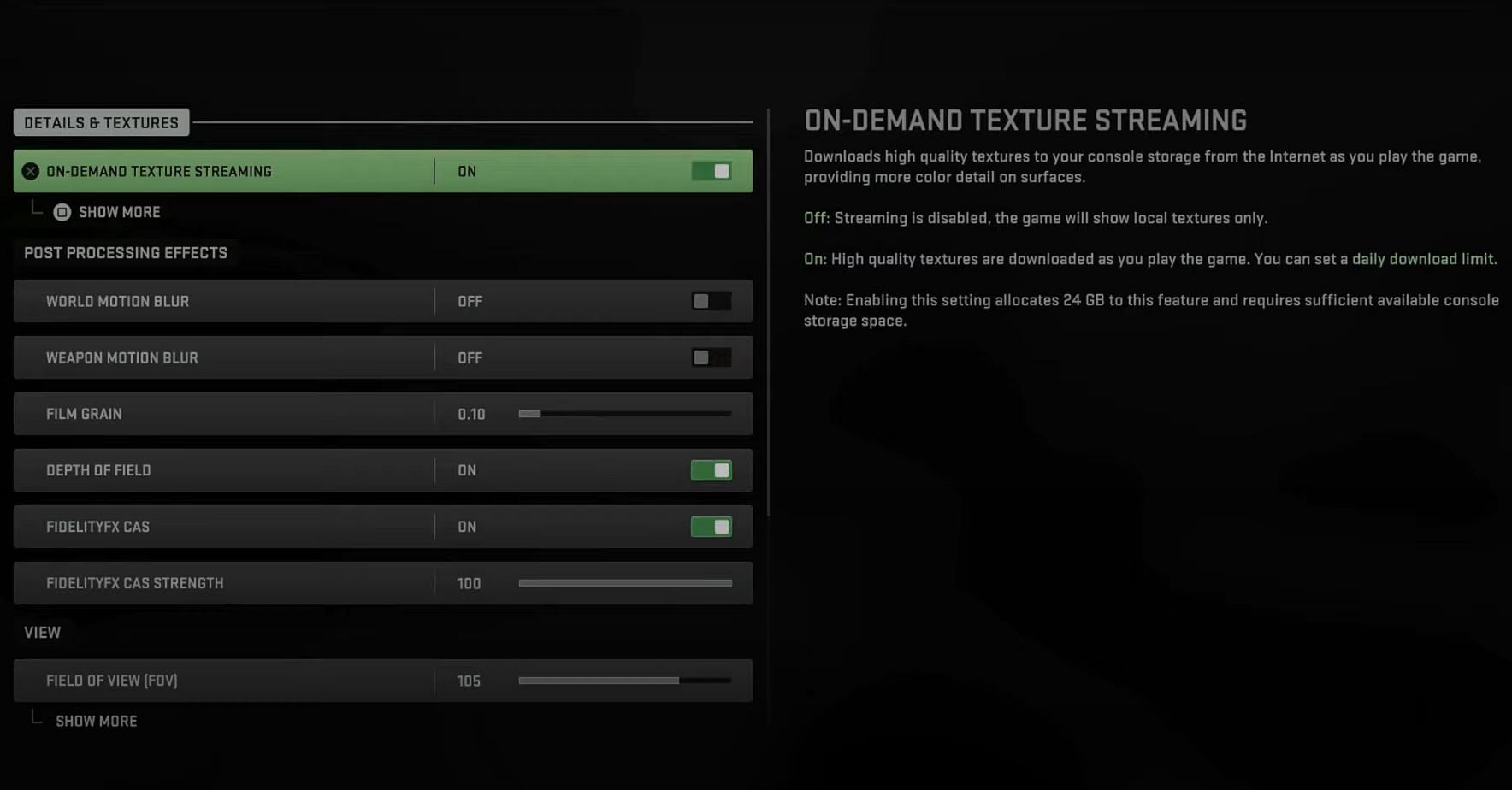 On-Demand Texture Streaming is a function that enhances a game's visual quality by downloading high-quality textures in the background while it is being played. Since textures are downloaded between matches, it may cause packet bursts, and turning it off is the simplest method to avoid the problem.