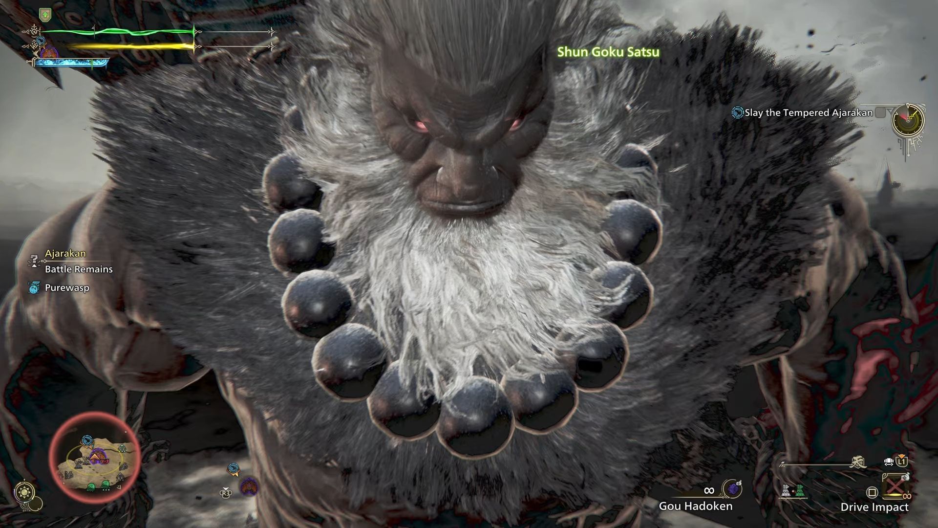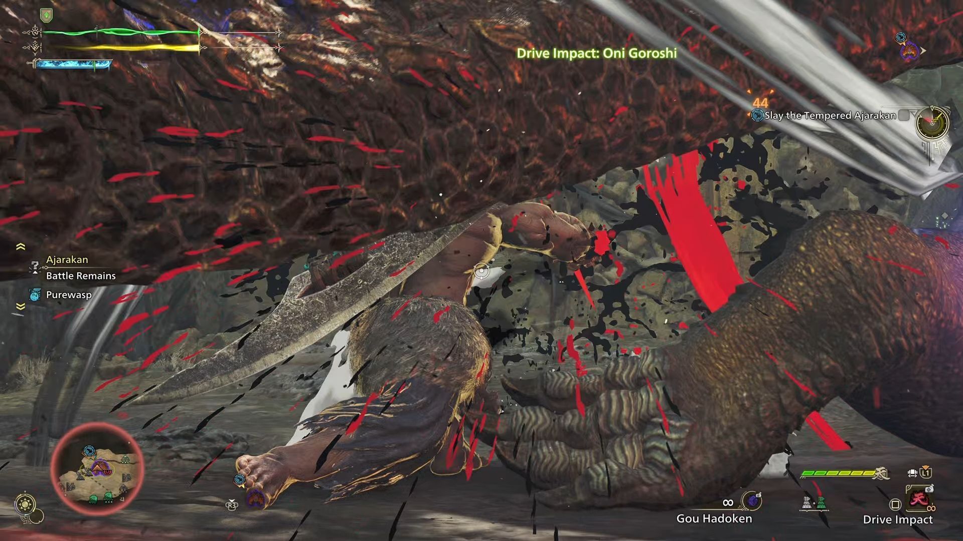 If you hit a wound or weak point on the monster with Drive Impact, you will perform Shun Goku Satsu, a short cutscene where Akuma delivers repeated blows to the monster in Monster Hunter Wilds. As mentioned earlier, equipping the full set will give Drive Impact an offset effect. Both Shun Goku Satsu and a Drive Impact offset attack will deplete the Drive Gauge.