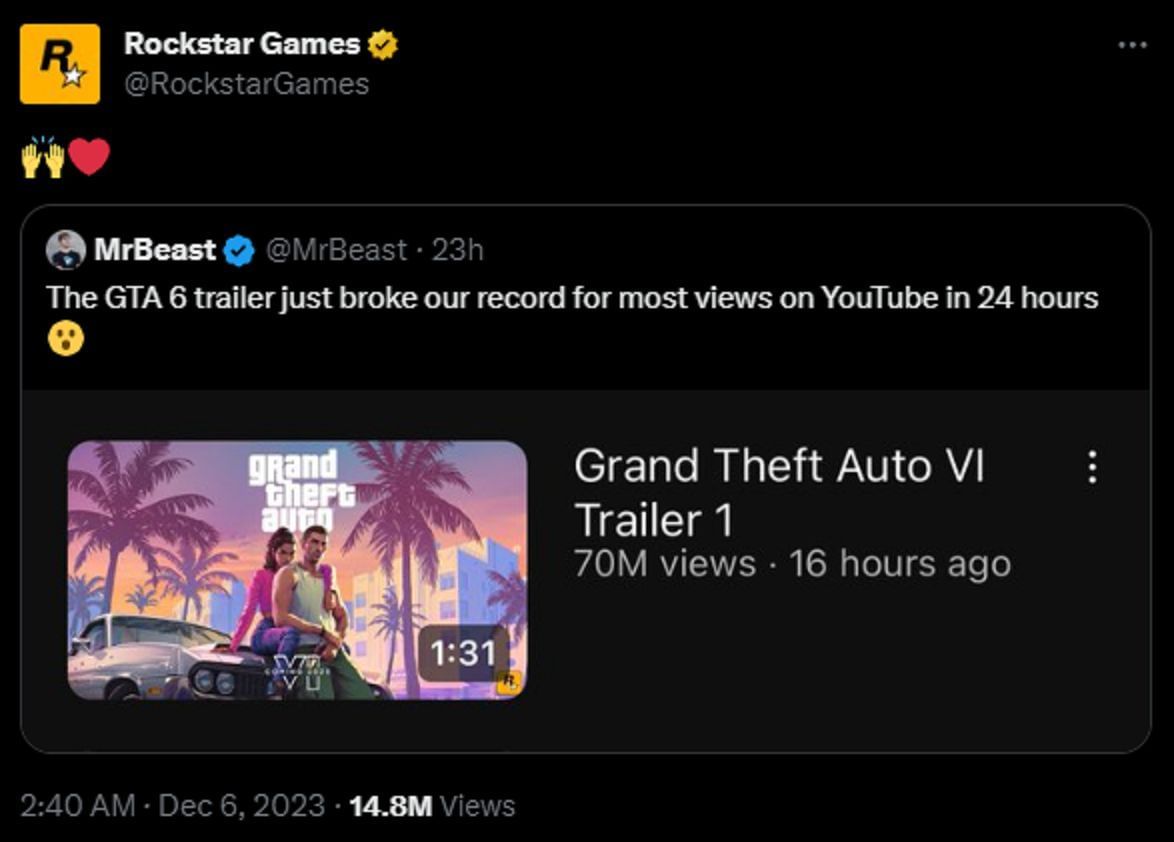 Jimmy posted his reaction yesterday (December 6, 2023), stating how the much-anticipated GTA 6 trailer had recorded over 80 million views in less than 24 hours, breaking one of his video records. Today, Rockstar Games reacted to his post by stating: