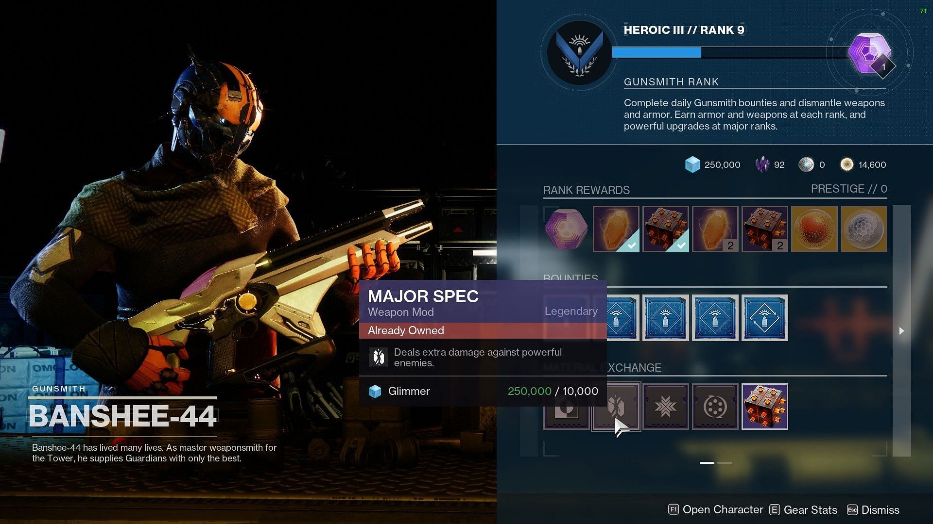 Lastly, the mods available this week are Major Spec, Target Adjuster, and Counterbalance Stock, which are available for 10,000 Glimmers each.