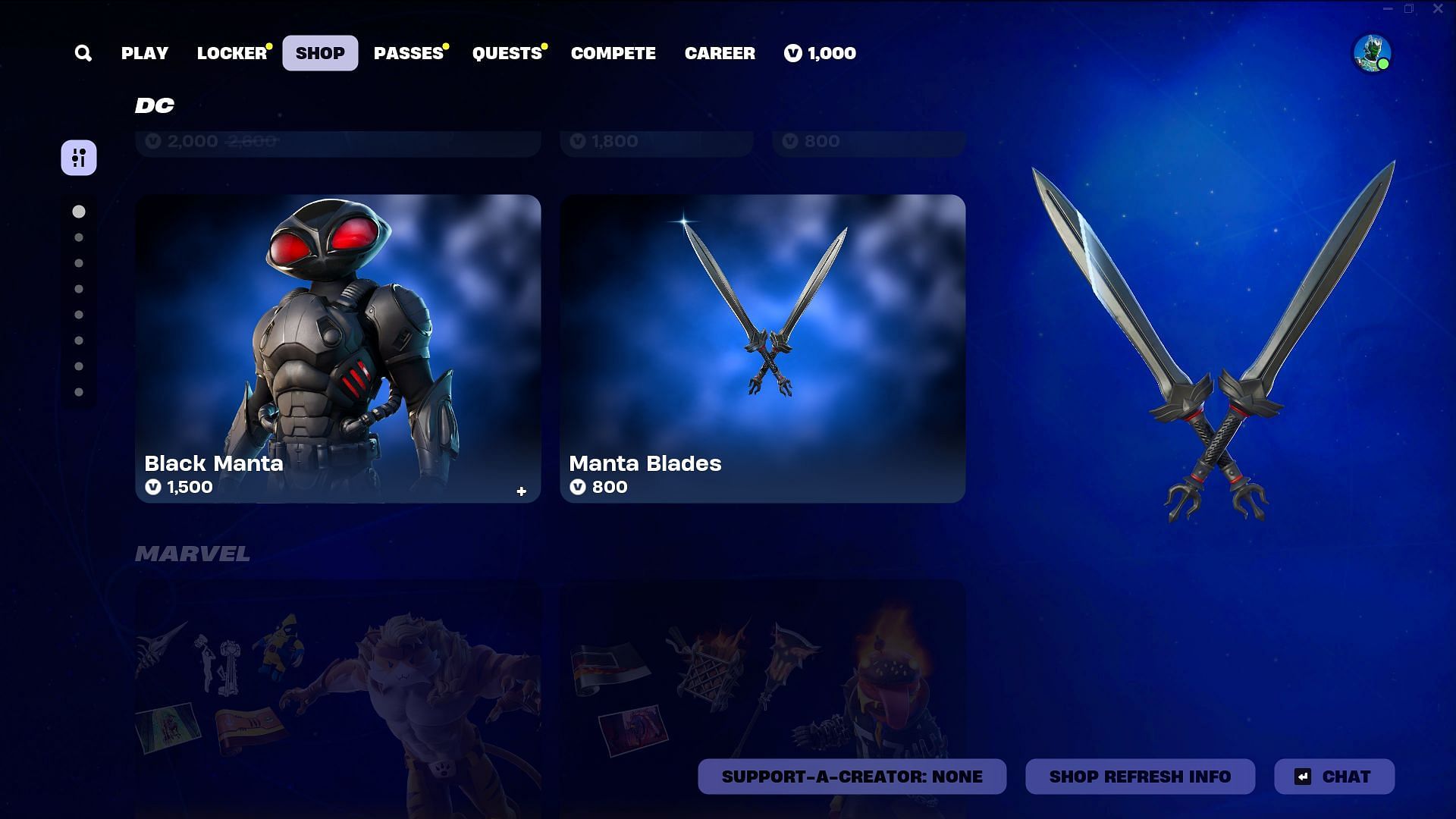 Black Manta (Outfit) + Black Manta (LEGO Outfit) and Manta Pack (Back Bling + Reactive) can be purchased for 1,500 V-Bucks. Manta Blades (Pickaxe) can be purchased for 800 V-Bucks.