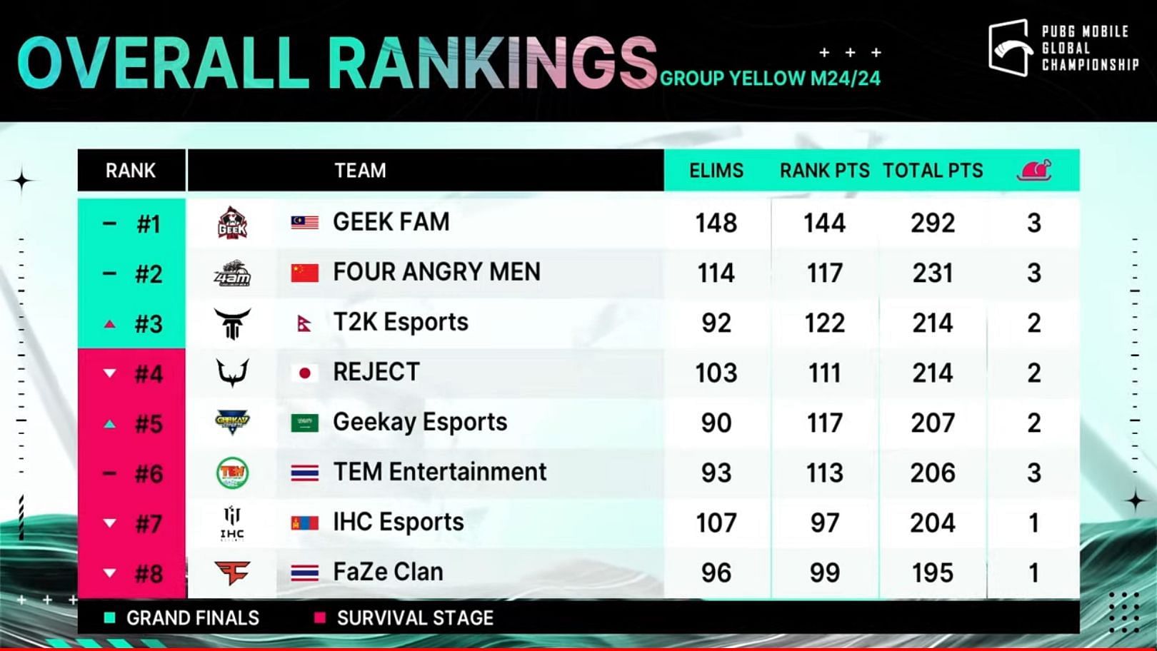 T2K edged out the Japanese team, Reject. Both were tied after the end of 24 matches in terms of overall points. Trained to Kill, however, qualified for the Grand Finals because they had acquired more placement points than Reject. The squad had 214 points with 92 eliminations at the end of the 24 games.