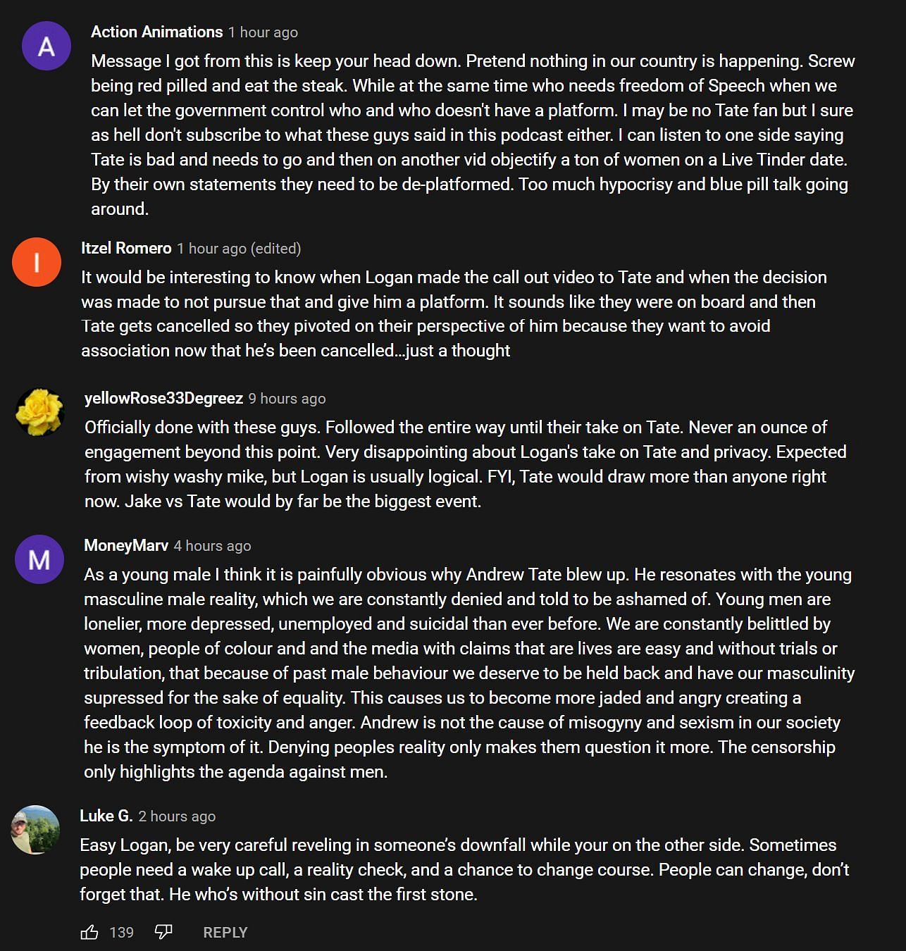 Since both Logan Paul and Andrew Tate have been able to garner a lot of fans, albeit in different timeframes, there have been a lot of mixed reactions. Some fans believe that Tate is not a source of misogyny but a product of it. Here are some of the comments that were made: