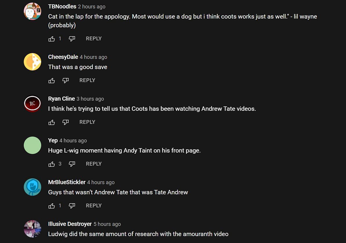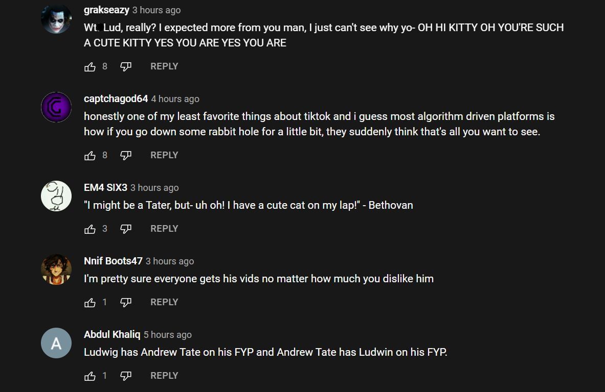 The clip immediately gained traction among Ludwig's fans as they continued the playful banter down in the YouTube comments. Many joked about the cat and how it distracted them from the real problem. Others commented on how social media algorithms push toxic content like Andrew Tate's clips. Nnif Bootz47 wrote: