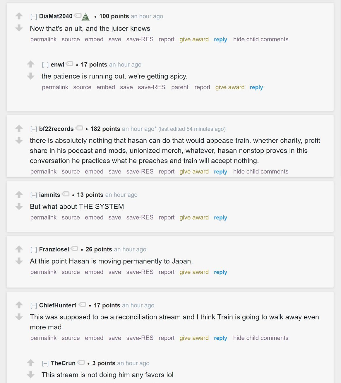 A reaction thread featuring the clip received over 110 comments. While one Redditor joked that HasanAbi was considering "permanently moving" to Japan, another community member claimed that the two streamers would not reconcile after the heated discussion.