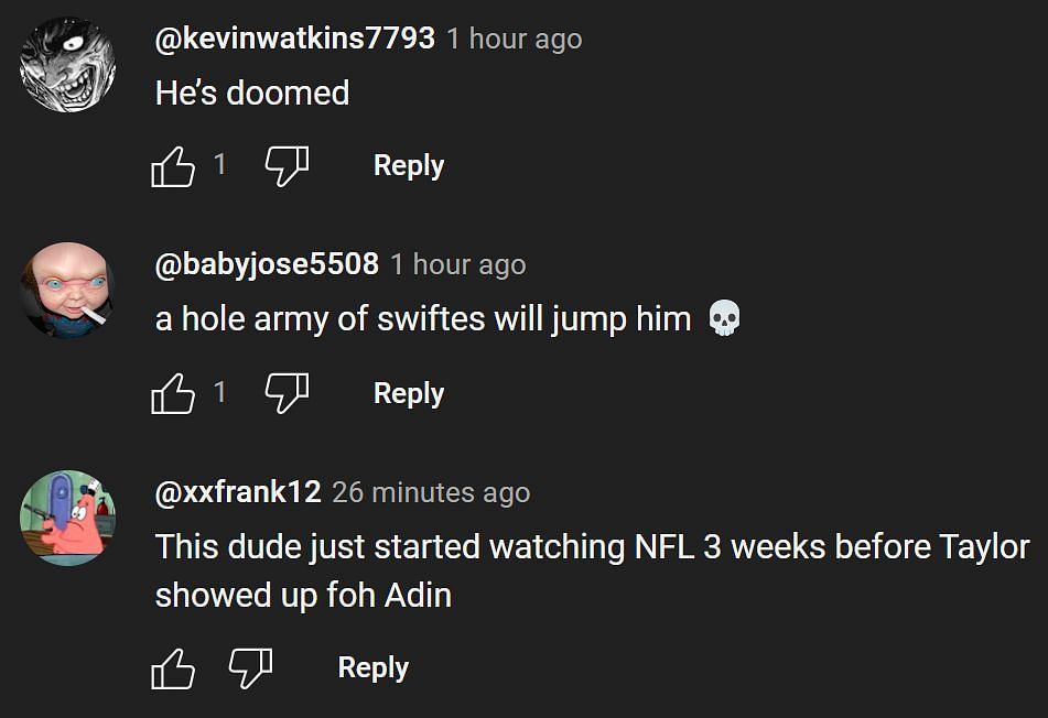 Adin Ross' statements about the Kansas City Chiefs and Taylor Swift have generated significant traction in the YouTube Shorts comment section. Here's a snippet of some notable ones: