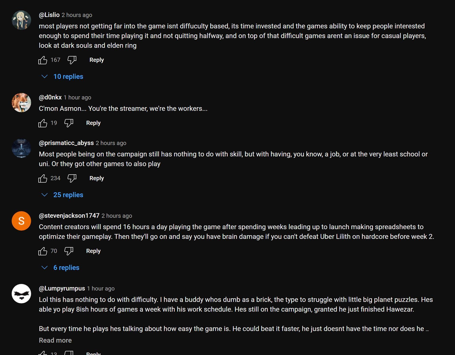 His viewers, however, disagreed with the statement that the reason for a lower completion rate is difficulty. Many pointed out that finishing a campaign is, in reality, more a function of having free time over how difficult the game is: