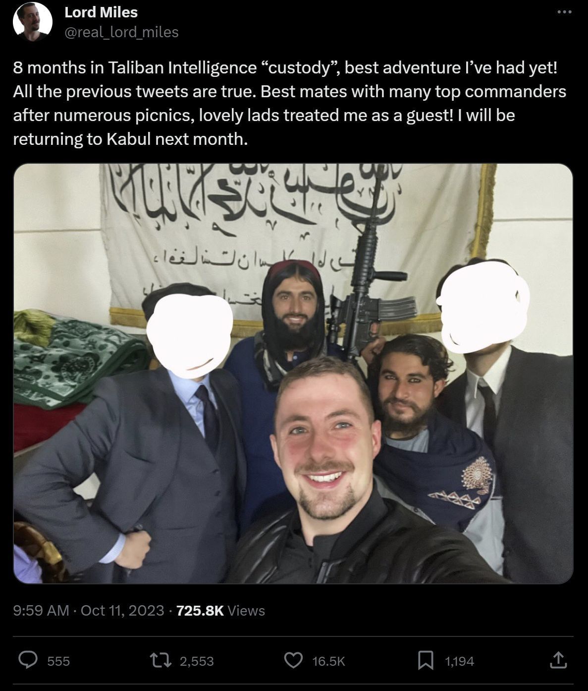 Miles Routledge, better known as "Lord Miles," has become the talk of the town on social media after being released by the Taliban. For those unaware, the content creator was arrested in Afghanistan at the beginning of this year. Things took a turn for the worse on March 15, 2023, when The Taliban Public Relations Department Commentary's handle on X (formerly Twitter) wrote:
