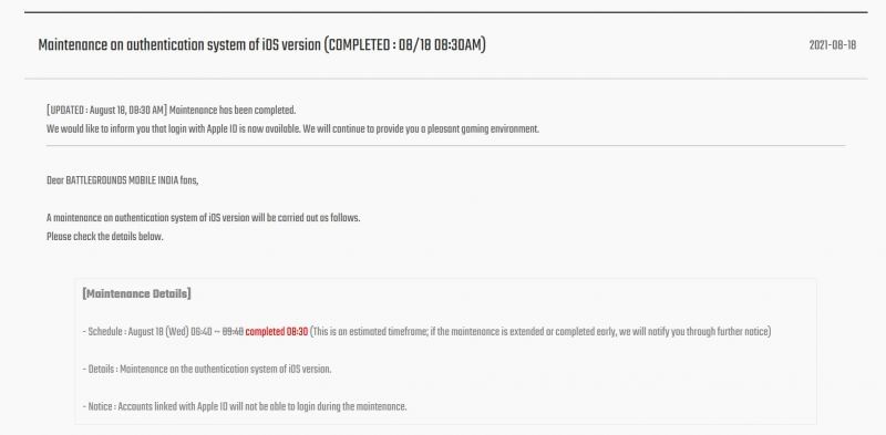 "A maintenance on authentication system of iOS version will be carried out as follows. Accounts linked with Apple ID will not be able to log in during the maintenance."