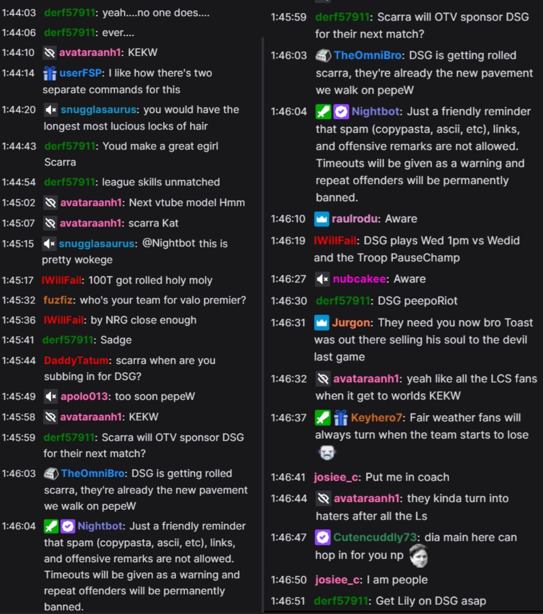 "Do you guys know how DSG has been playing recently, right? (Pokimane asks what Scarra meant) Umm... how do I phrase this? When they... say the alphabet (when) they can't find the, 'W.' They're going to turn it around for sure, right?"