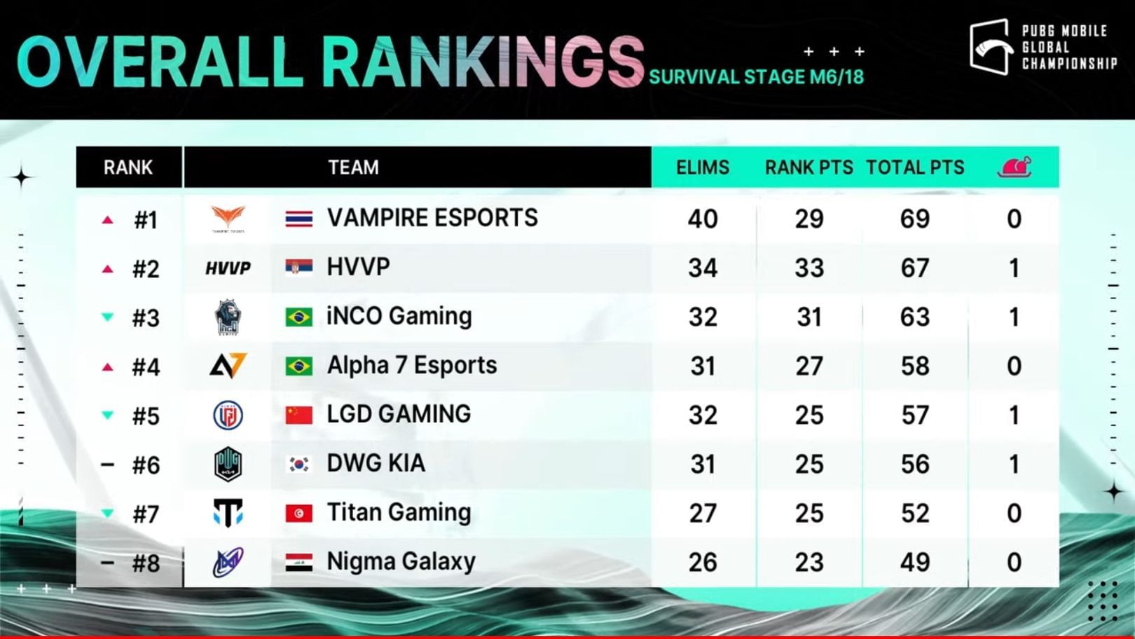 This squad was in top form today, bagging multiple eliminations left, right, and center. Although the side couldn't secure a Chicken Dinner, consistent top-place finishes and 40 eliminations took them to the pole position with 69 points.