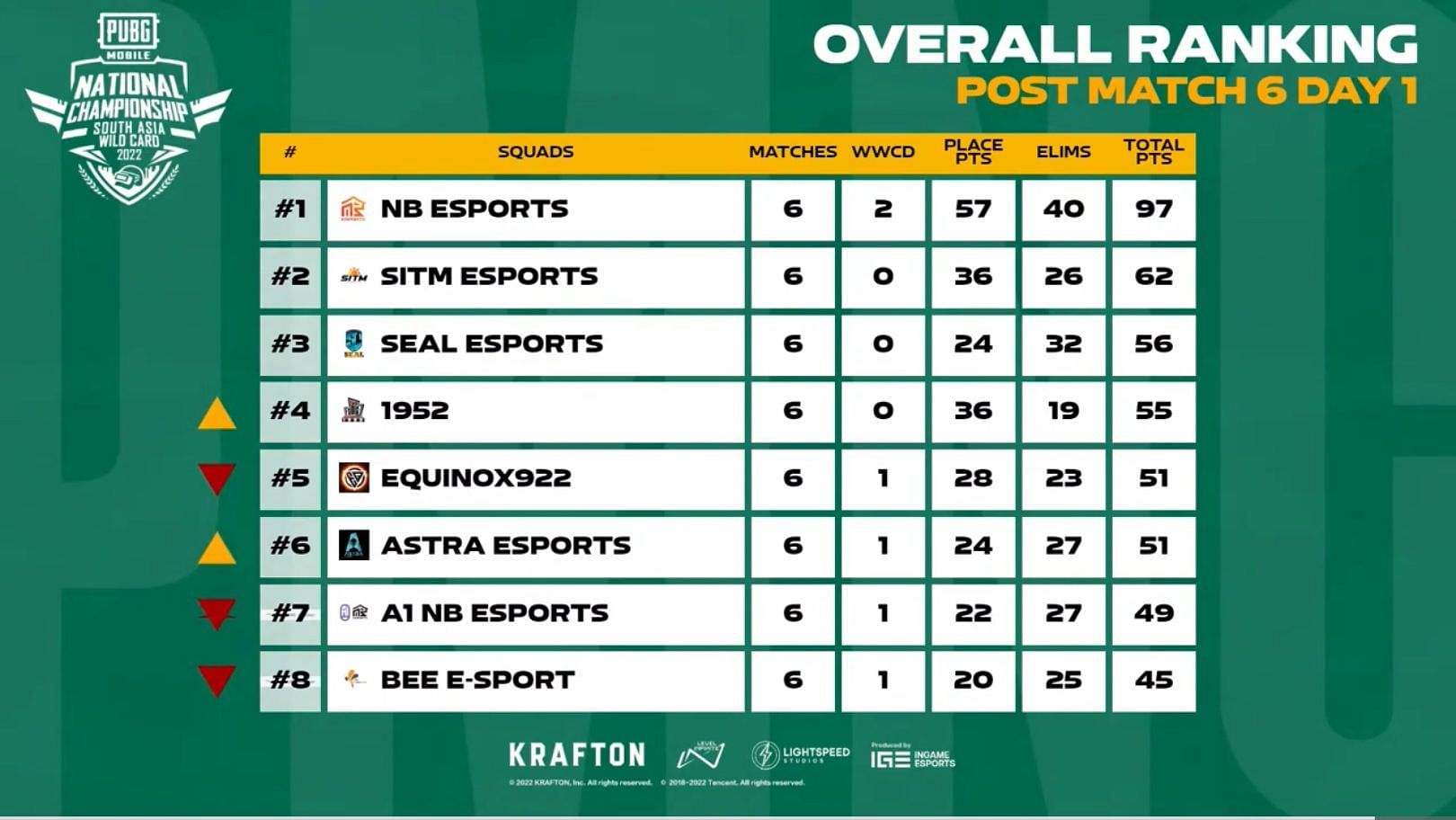 The Grand Finals of the PMNC 2022 South Asia Wildcard commenced on December 27, with NB Esports leading the overall standings after six matches. The underdog Mongolian team scored 97 points, after consistent outings on the opening day. They clinched two Chicken Dinners in the second and fourth matches, which helped them take a 35-point lead over the second-placed team. As a result of their aggressive gameplay, the team scored 40 kills, the highest number of kills so far.