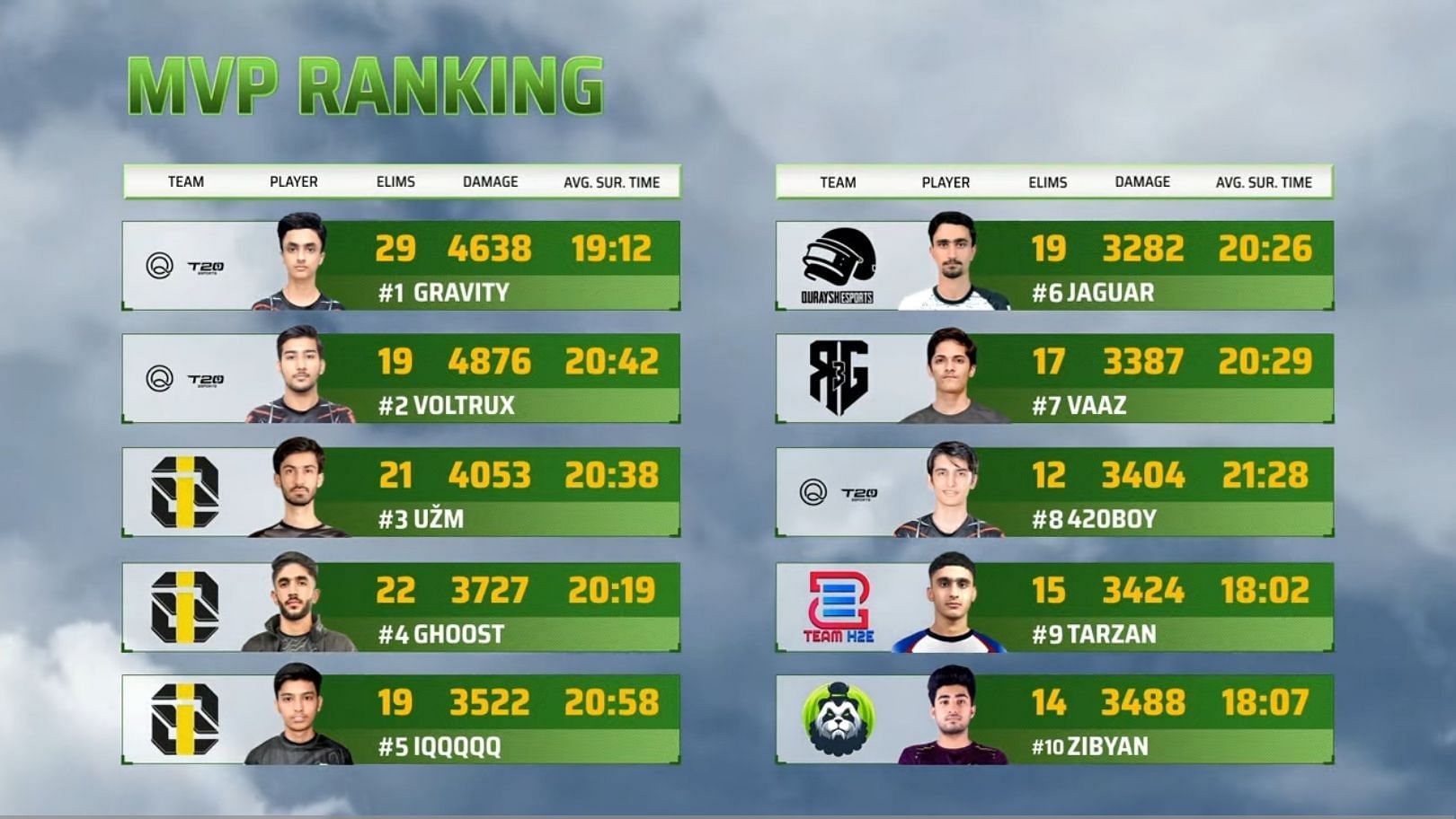 Gravity leads the MVP rankings with 29 kills and 4638 damage, followed by his teammate Voltrux with 19 kills and 4876 damage.
