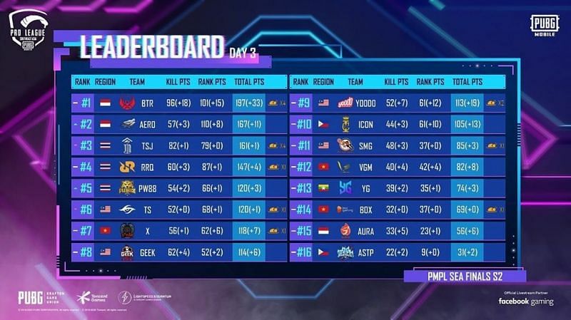 In the overall leaderboard of the PUBG Mobile Pro League South East Asia Season 2 finals, Bigetron RA scored 197 points with 96 kills. Following them was the runners-up, Aerowolf LIMAX with 57 kills and 167 points, while Secret Jin grabbed the third place with 82 kills and 161 points
