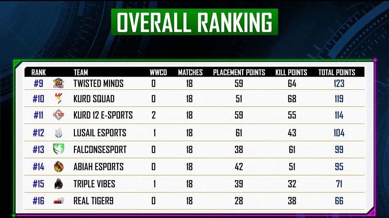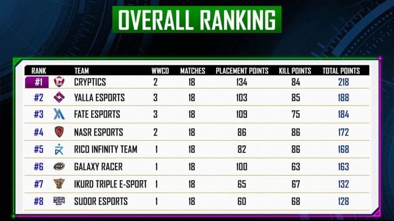 Cryptics dominated the first day of the finals. A second-day drop brought them to second place, but a strong final day brought them back to first. Cryptics acquired the roster of RTG Esports that came into PMPL by winning PMCO: MENA Wildcard. YaLLa Esports took second place, while FATE Esports finished third on the list. Galaxy Racer had an underwhelming final as they finished in sixth place.